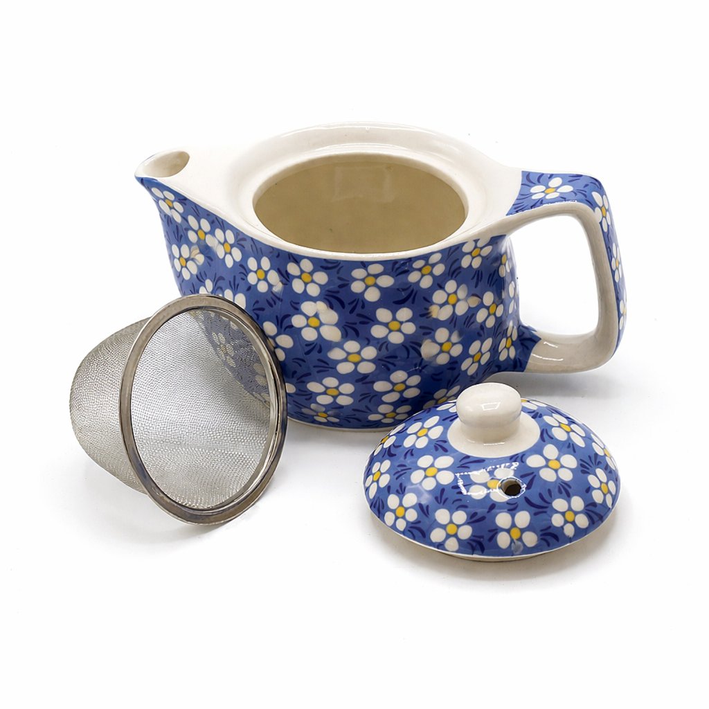 Čajová konvice MODRÝ KVĚT je elegantní keramická konvice s jemným květinovým motivem, která spojuje praktické využití s výrazným dekorativním vzhledem. Modrý podklad zdobený bílými květy se žlutým středem působí tradičně, čistě a velmi nadčasově, díky čemuž se konvice hodí jak do moderních, tak i rustikálních interiérů.