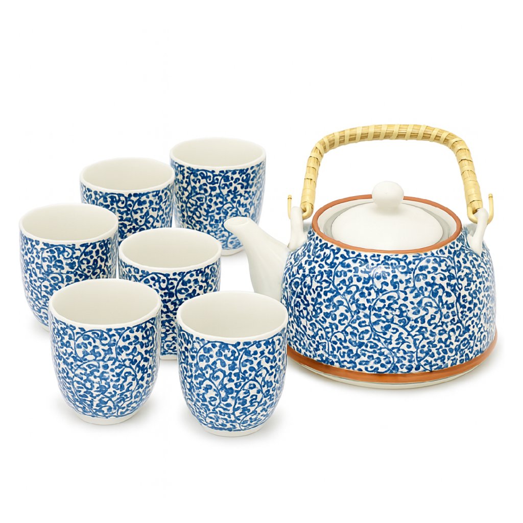 Keramická čajová souprava BLUE LEAF 0,85 l se sítkem a 6 šálky
