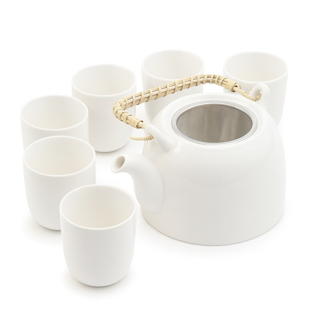 Keramická čajová souprava CLASSIC WHITE 0,85 l s nerezovým sítkem a 6 šálky