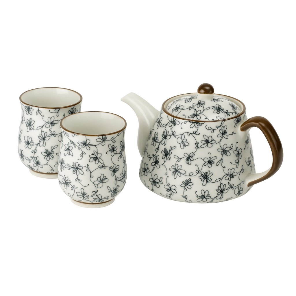 Květinový dekor na bílé glazuře dodává soupravě jemný, tradiční charakter. Tvar konvice je zaoblený s výběžkem pro plynulé nalévání, šálky mají klasický válec tvar. Jemné proporce a decentní výzdoba dělají z FURAWA elegantní volbu pro každodenní i slavnostní použití.