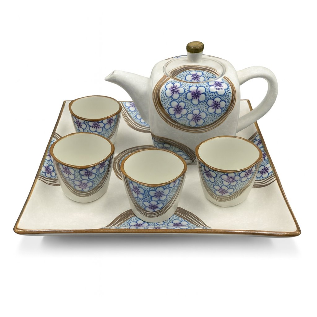 Elegantní čajová souprava Mela s dekorem květů a podnosem – ideální pro stylové podávání čaje s nádechem orientální estetiky.