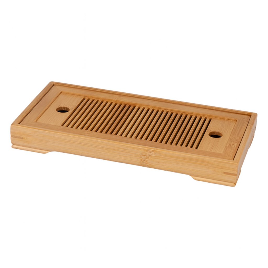 Podnos je vybaven mřížkovaným povrchem, který zachytává přebytečnou vodu a čaj. Pod ním se nachází vnitřní odkapávací prostor, kam tekutina volně stéká, takže čajová souprava i okolí zůstávají suché. Bambusová konstrukce zajišťuje pevnost, lehkost a přirozený vzhled, který se hodí do každého interiéru.