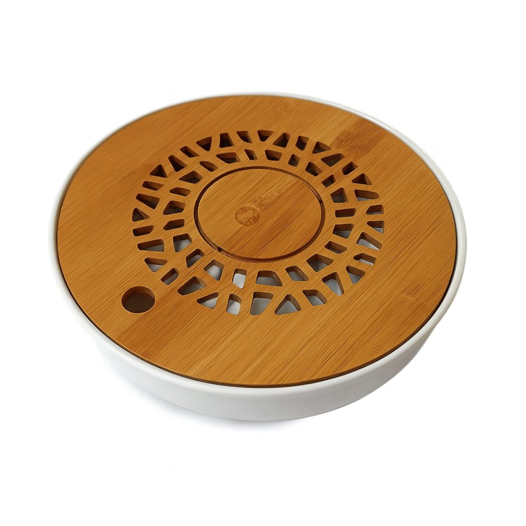 Elegantní čajové moře Min Jiang v moderním kulatém designu z bambusu a keramiky – stylový doplněk pro čajový rituál s precizním zpracováním.