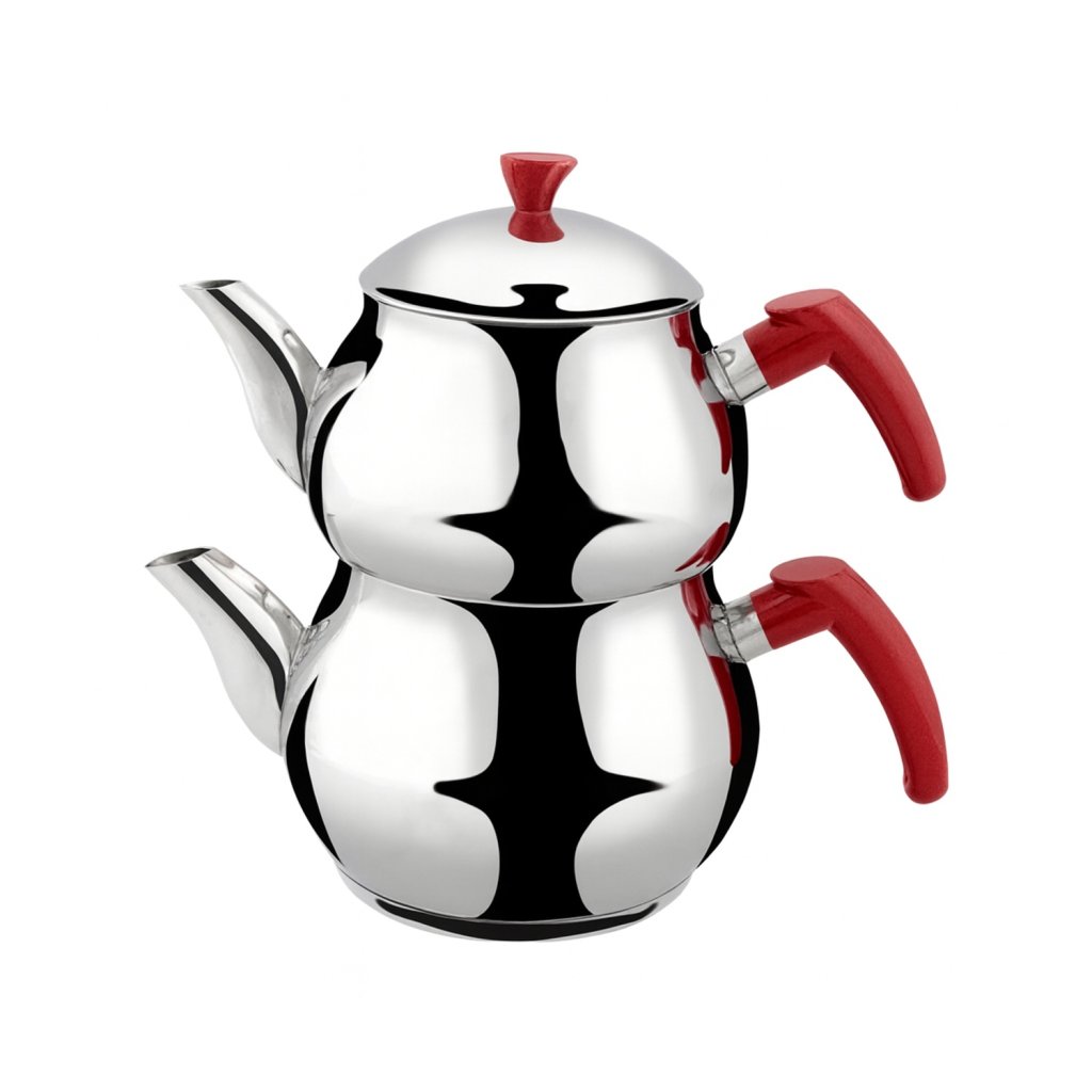 Model Aile Boy má tradiční baculatý tvar, který podporuje cirkulaci tepla a rovnoměrné ohřívání obsahu. Lesklý povrch nerezu snadno doplňuje červené detaily – kontrast, který dává konvici výrazný a přitažlivý vzhled. Dvojkonvice umožňuje preparaci „koncentrovaného čaje“ v horní části a ředění podle chuti z dolní části.