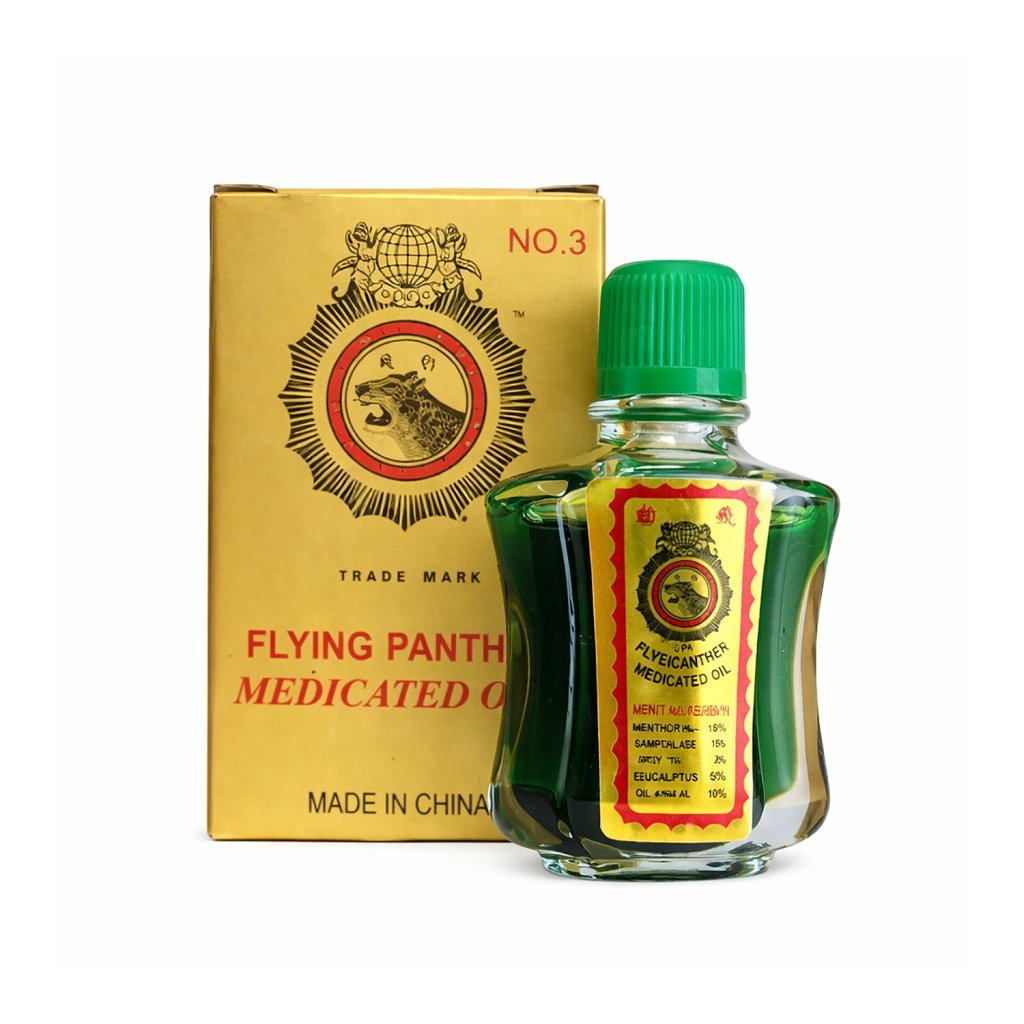 Čínský olej Flying Panther Medicated Oil 3 ml je tradiční orientální bylinný olej určený k lokální aplikaci na pokožku. Vyznačuje se výraznou mentolovo-kafrovou vůní a rychlým nástupem účinku, který přináší pocit ochlazení a následného prohřátí. Díky své malé velikosti je ideální jako pohotovostní pomocník do kapsy, kabelky i lékárničky.