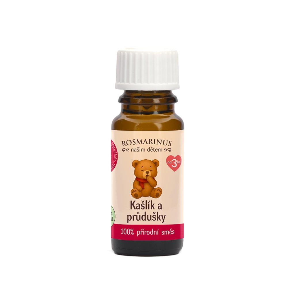 Dětský aroma olej Kašlík a průdušky je 100% přírodní směs esenciálních olejů pro děti od 3 let. Pomáhá uvolnit dýchací cesty, zklidnit kašel a podpořit klidné dýchání během dne i noci.