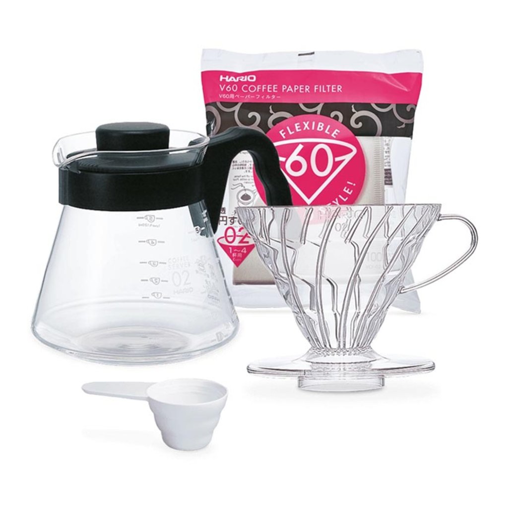 Sada obsahuje plastový dripper V60, skleněný server, odměrku a papírové filtry. Stačí přidat kávu a horkou vodu – a můžete si připravit čistý šálek kávy s plným aroma a jemnou chutí.