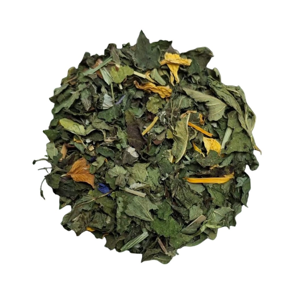 Meduňka, kousky jablek, list maliny, sléz, sedmikráska, list ostružiny, zelený oves, měsíček, černý bez, květ slunečnice, květ růže, květ chrpy.