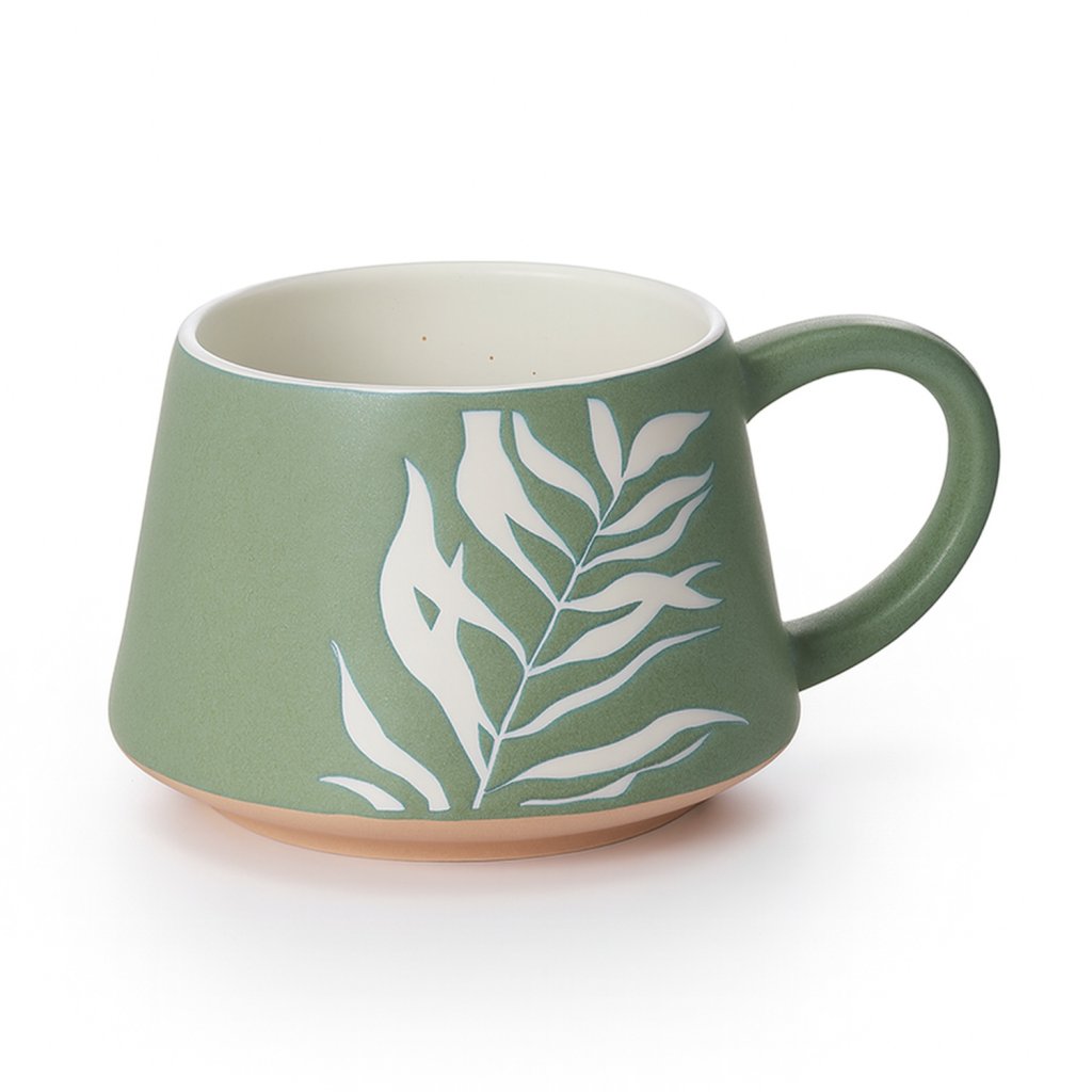 Elegantní hrnek LEANA green v moderním matném provedení, zdobený jemným botanickým motivem. Ideální pro každodenní pití čaje či kávy.
