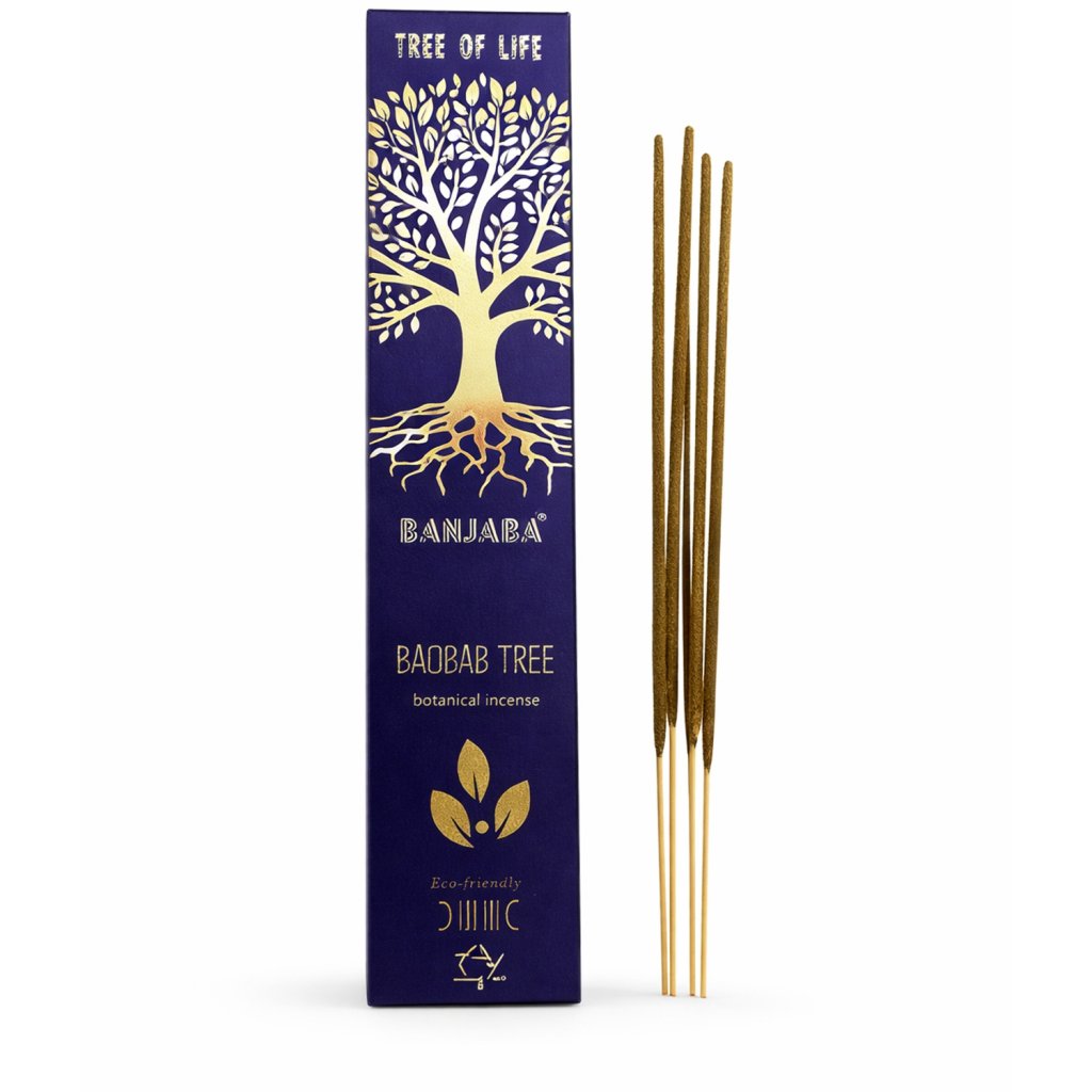 Indické vonné tyčinky BANJARA Tree of Life – Baobab Tree jsou přírodní vonné tyčinky inspirované legendárním stromem baobab (Adansonia), který je v Africe známý jako „strom života“. Tento majestátní strom symbolizuje sílu, dlouhověkost a stabilitu. Vůně tyčinek přináší do prostoru pocit klidu, uzemnění a přirozené harmonie.
