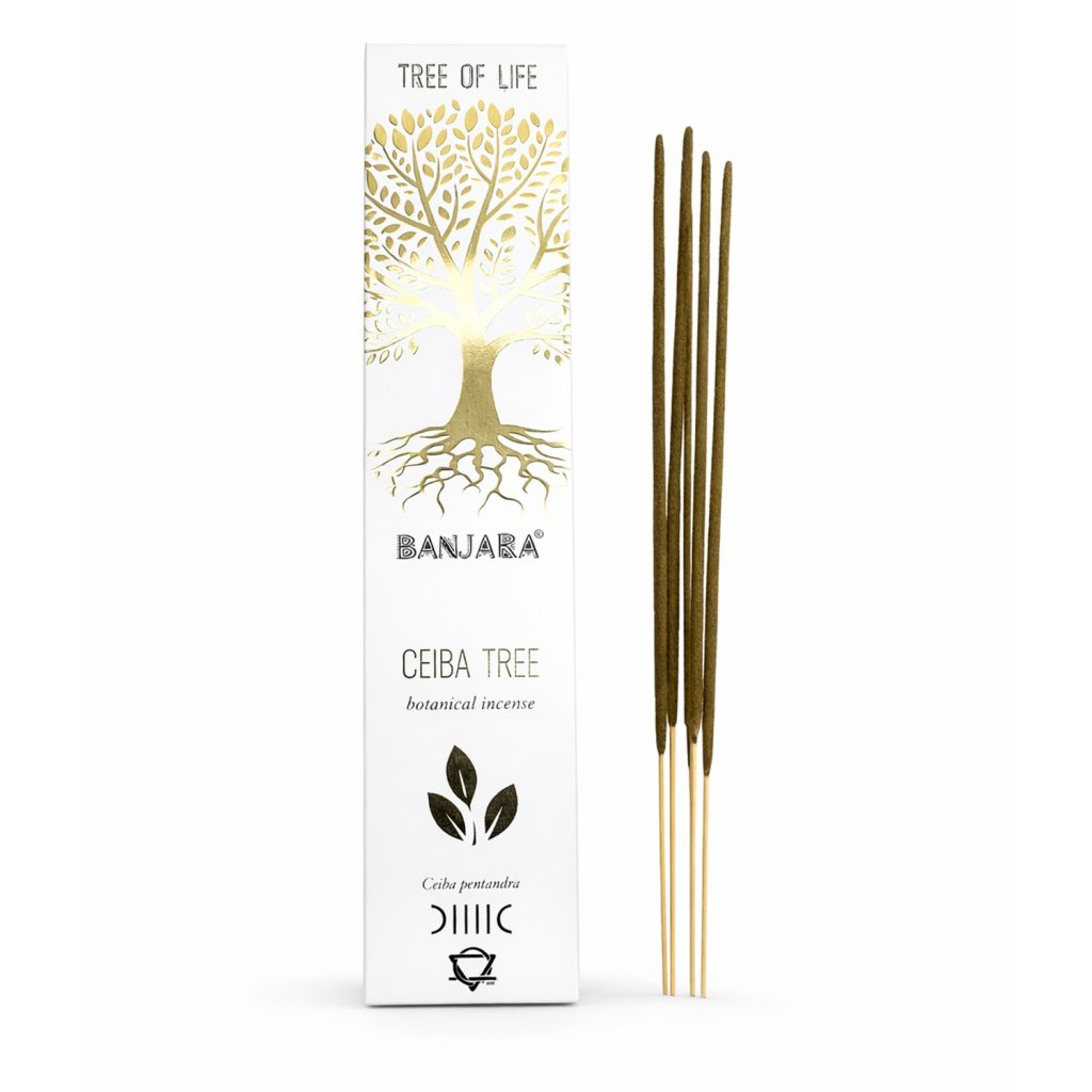 Indické vonné tyčinky BANJARA Tree of Life – Ceiba Tree jsou přírodní vonné tyčinky inspirované stromem ceiba (Ceiba pentandra), který je v mnoha kulturách považován za posvátný strom života. Tento mohutný tropický strom symbolizuje spojení mezi nebem, zemí a podsvětím a je spojován s ochranou, moudrostí a životní energií.