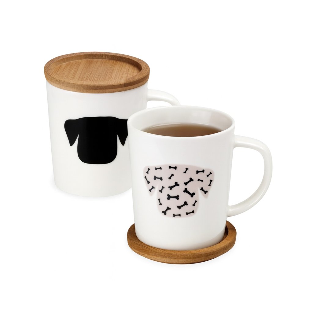 Hrnek je vyroben z kvalitního porcelánu, který výborně udržuje teplo a zároveň je příjemný na dotek. Součástí je dřevěné víčko, které lze využít také jako praktický podšálek. Tento detail nejen chrání nápoj před vychladnutím, ale zároveň působí elegantně a přirozeně. Hrnek je ideální pro čaj, kávu nebo horkou čokoládu a skvěle se hodí i jako dárek pro milovníky psů.