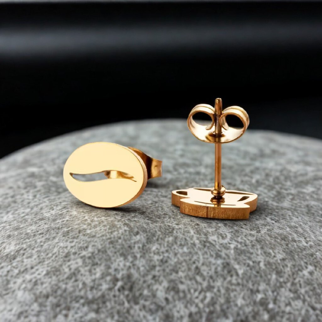 Elegantní peckové náušnice z nerezové oceli v teplém zlatém tónu. Hravý motiv kávového zrna a šálku potěší každého milovníka kávy.