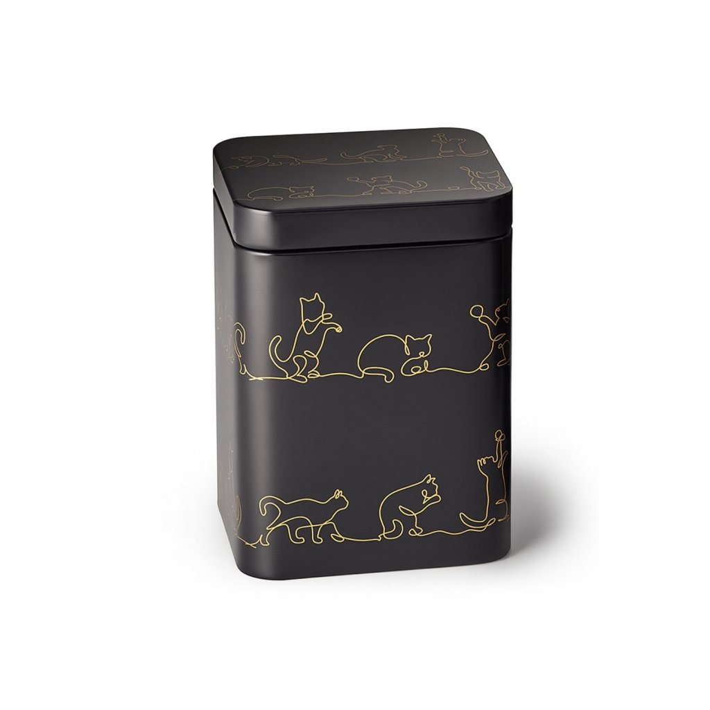 Díky kvalitnímu kovovému materiálu je dóza odolná a praktická. Pevné víčko chrání obsah před vzduchem a vlhkostí, čímž zachovává aroma a chuť čaje. Motiv zlatých koček v elegantních liniích působí decentně a zároveň hravě – perfektní doplněk pro každodenní čajové chvíle.