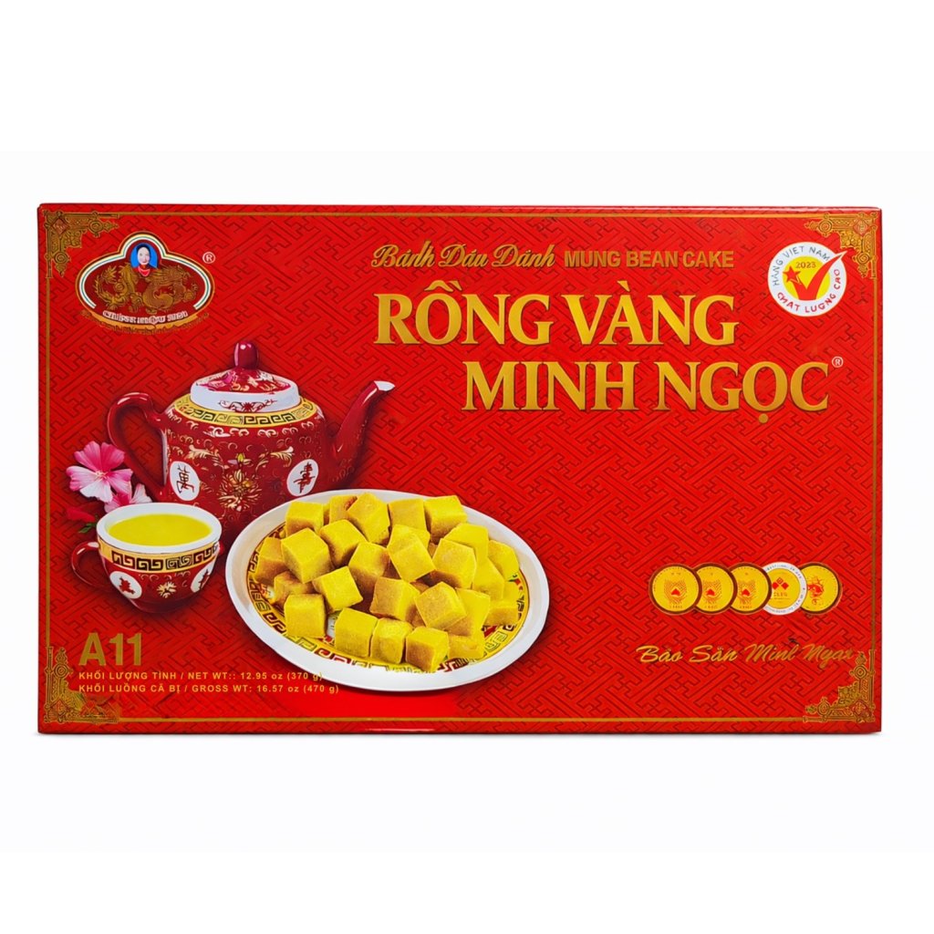 Rong Vang Minh Ngoc „Zlatý drak“ Mung Bean Cake je tradiční vietnamský dezert z mungo fazolí, který vyniká svou jemnou, sypkou strukturou a lehce nasládlou chutí. Elegantní červené balení se zlatými motivy symbolizuje štěstí, hojnost a prosperitu, což z této speciality dělá nejen sladkost, ale i krásný dárkový produkt.