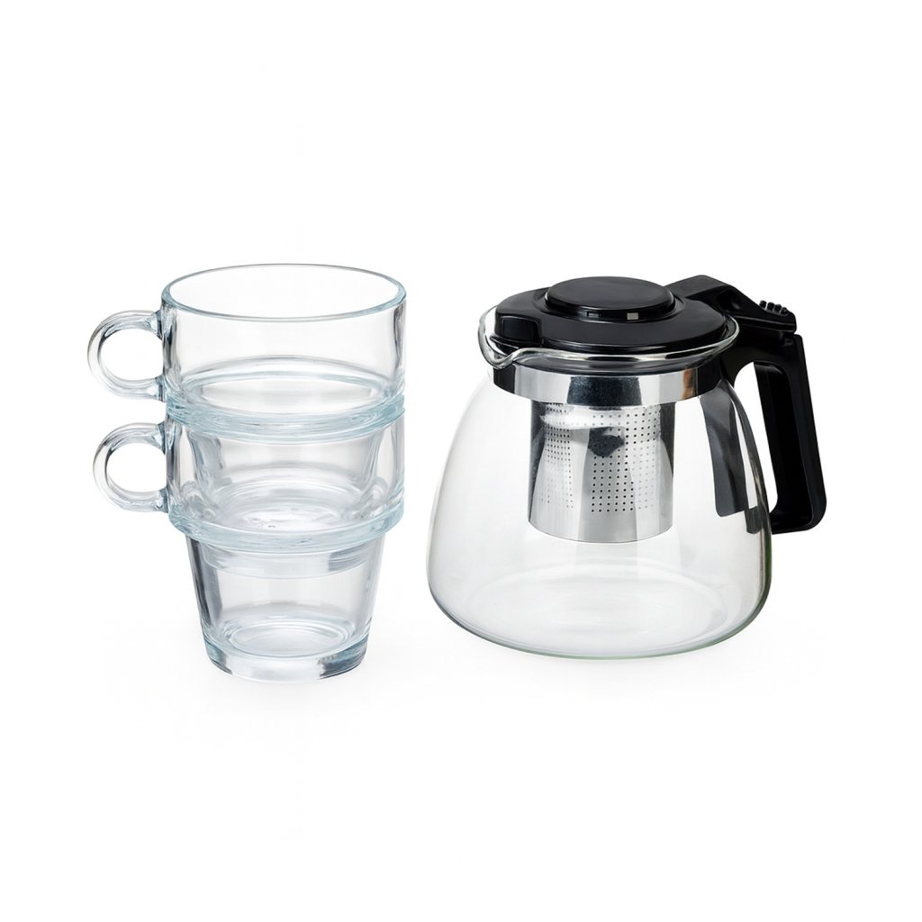 Konvice i šálky jsou vyrobeny z čirého, tepelně odolného skla, které odolává vysokým teplotám. Filtr z nerezové oceli zajišťuje dlouhou životnost a snadné čištění. Souprava se hodí jak pro klasické čaje, tak i pro moderní ovocné či bylinné nálevy.
