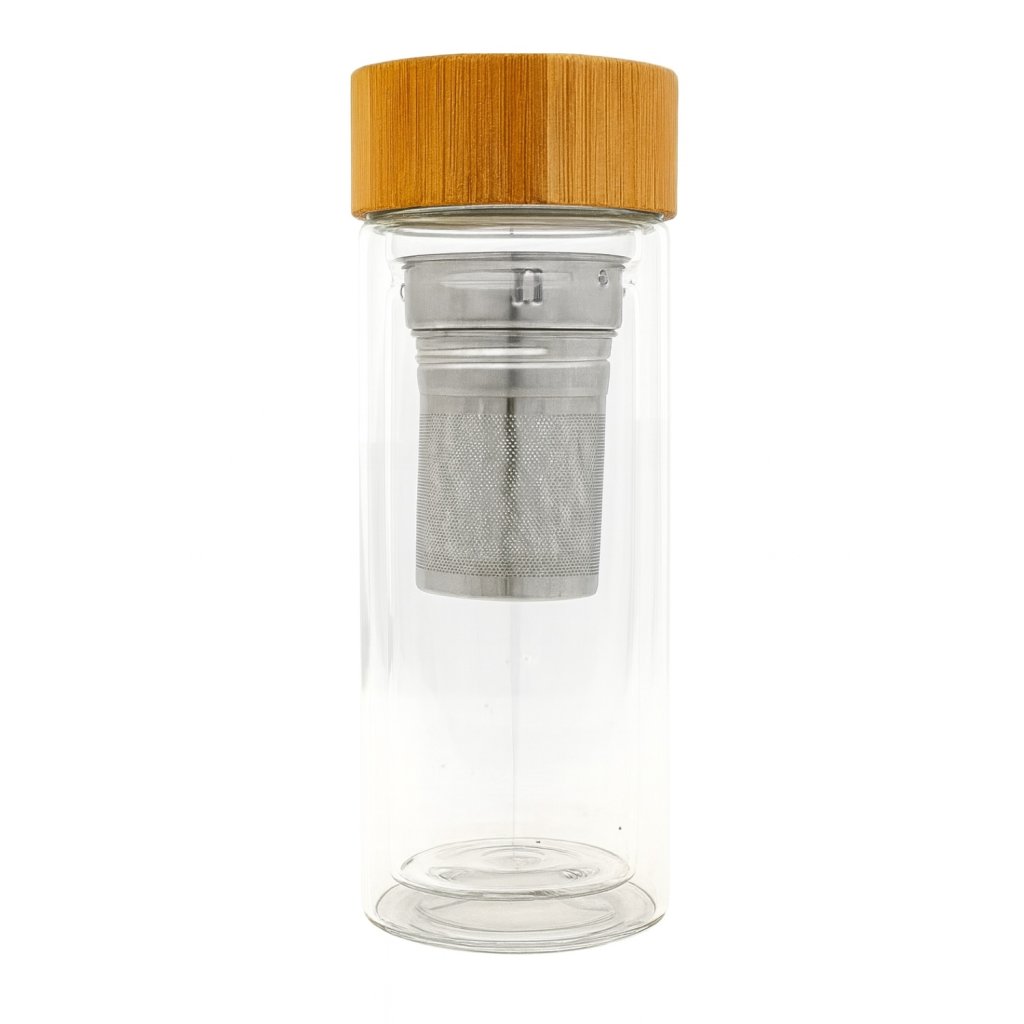 Elegantní skleněná termoska BAMBOO s dvojitou stěnou, nerezovým sítkem a bambusovým víčkem. Ideální na přípravu a přenášení čaje i studených nápojů.