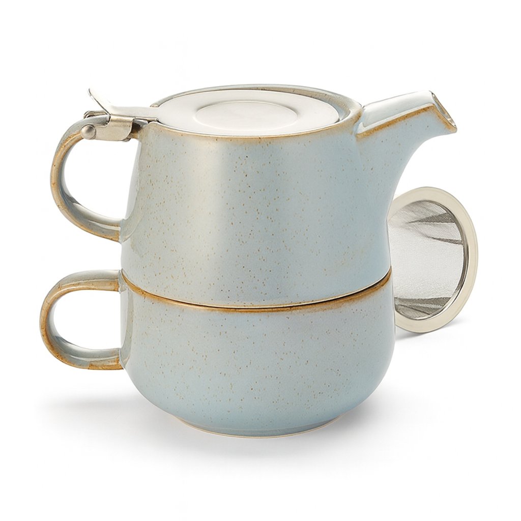 Tea For One MANS je stylová čajová souprava pro jednoho, která propojuje moderní design, kvalitní zpracování a pohodlí v každém doušku. Světlý modrý tón glazury s jemnými rustikálními detaily působí elegantně a přirozeně, čímž vytváří příjemnou atmosféru pro váš čajový rituál.