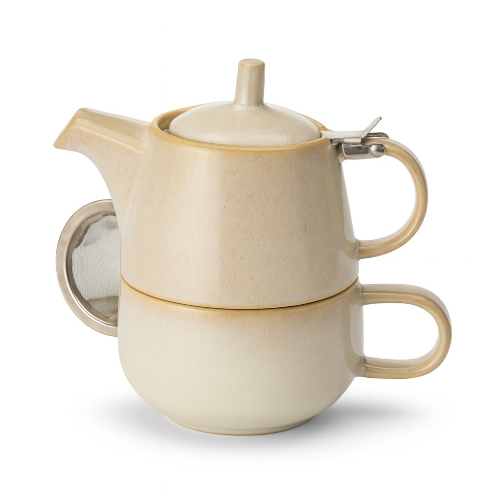 Jemná porcelánová souprava Tea For One TUVA v přírodních tónech béžové s nerezovým sítkem – ideální pro klidné chvíle s šálkem čaje.
