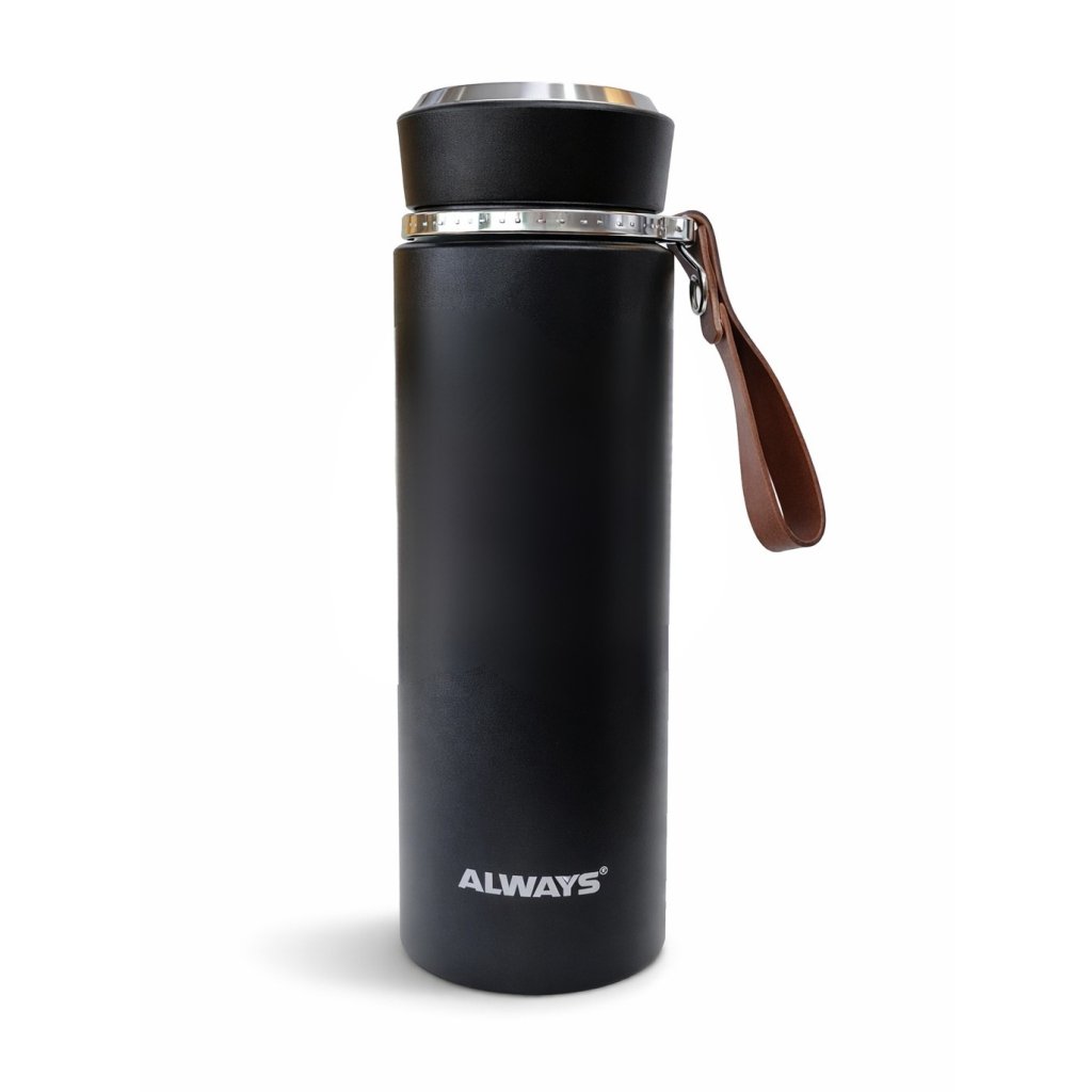 Termoska ALWAYS je stylové a praktické řešení pro každodenní hydrataci na cestách, v práci i při volnočasových aktivitách. Kombinuje moderní design s funkčností – elegantní černé provedení s povrchem v imitaci kůže působí luxusně a zároveň zajišťuje příjemný úchop.