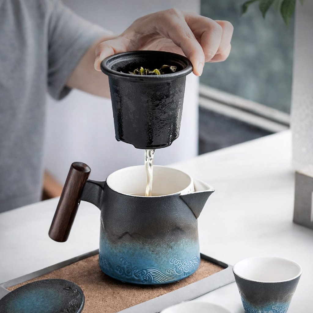 Souprava zaujme svou jedinečnou glazurou v odstínech modré a černé, která evokuje hloubku horského jezera Pamír. Vyrobená je z vysoce kvalitní keramiky s jemně reliéfním dekorem vln na spodní části konvičky. Dřevěná rukojeť dodává celku příjemný přírodní kontrast a zároveň zajišťuje pohodlné držení při zalévání čaje.