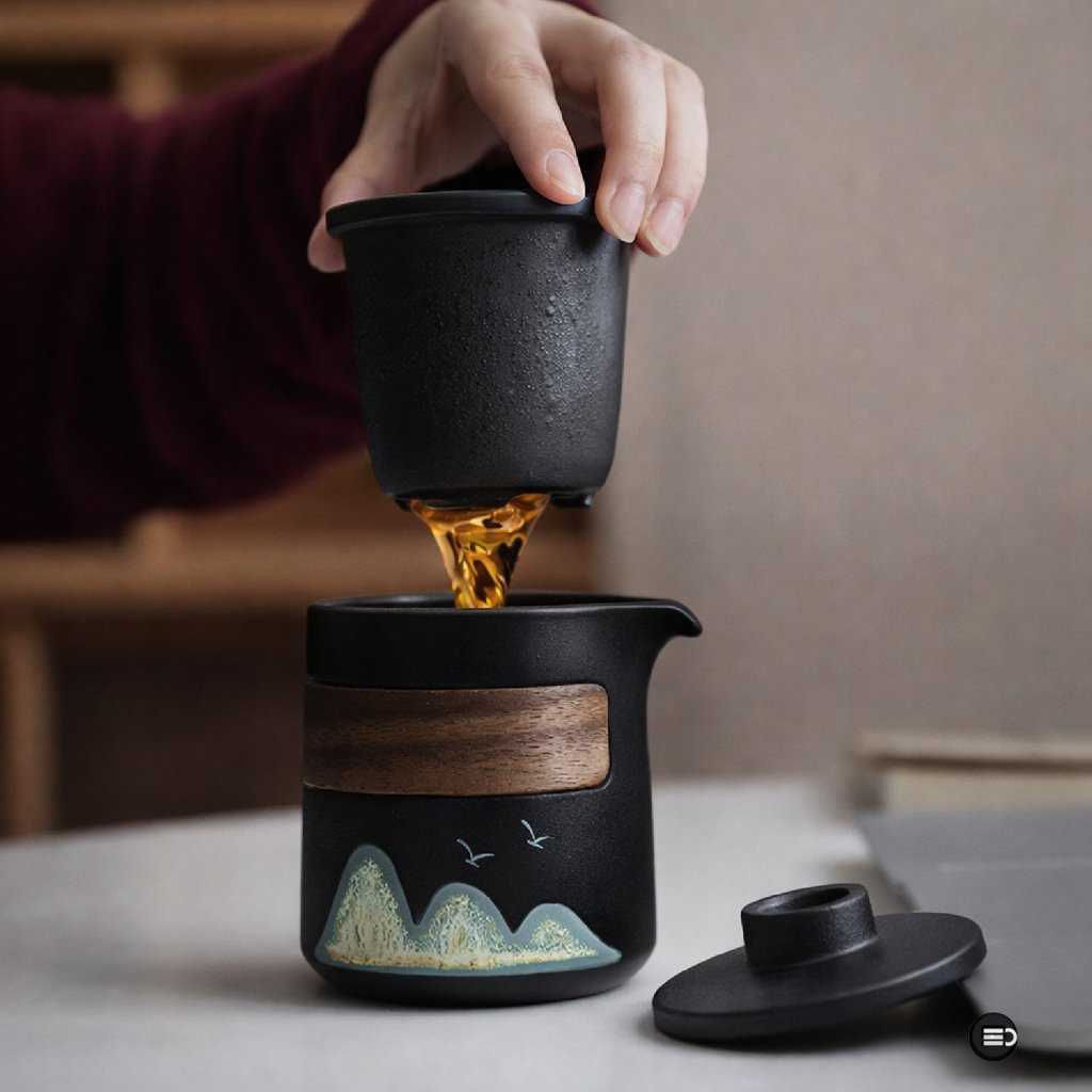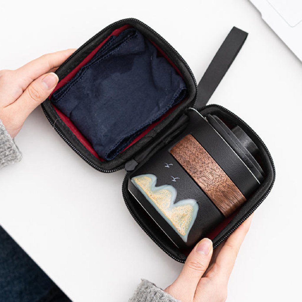 Všechny komponenty jsou bezpečně uloženy v pevném, uzavíratelném pouzdru, které chrání keramiku při přenášení a usnadňuje organizaci celé sady. Díky kompaktním rozměrům je souprava ideální na cesty, do práce, na čajové výlety i pro venkovní přípravu čaje.