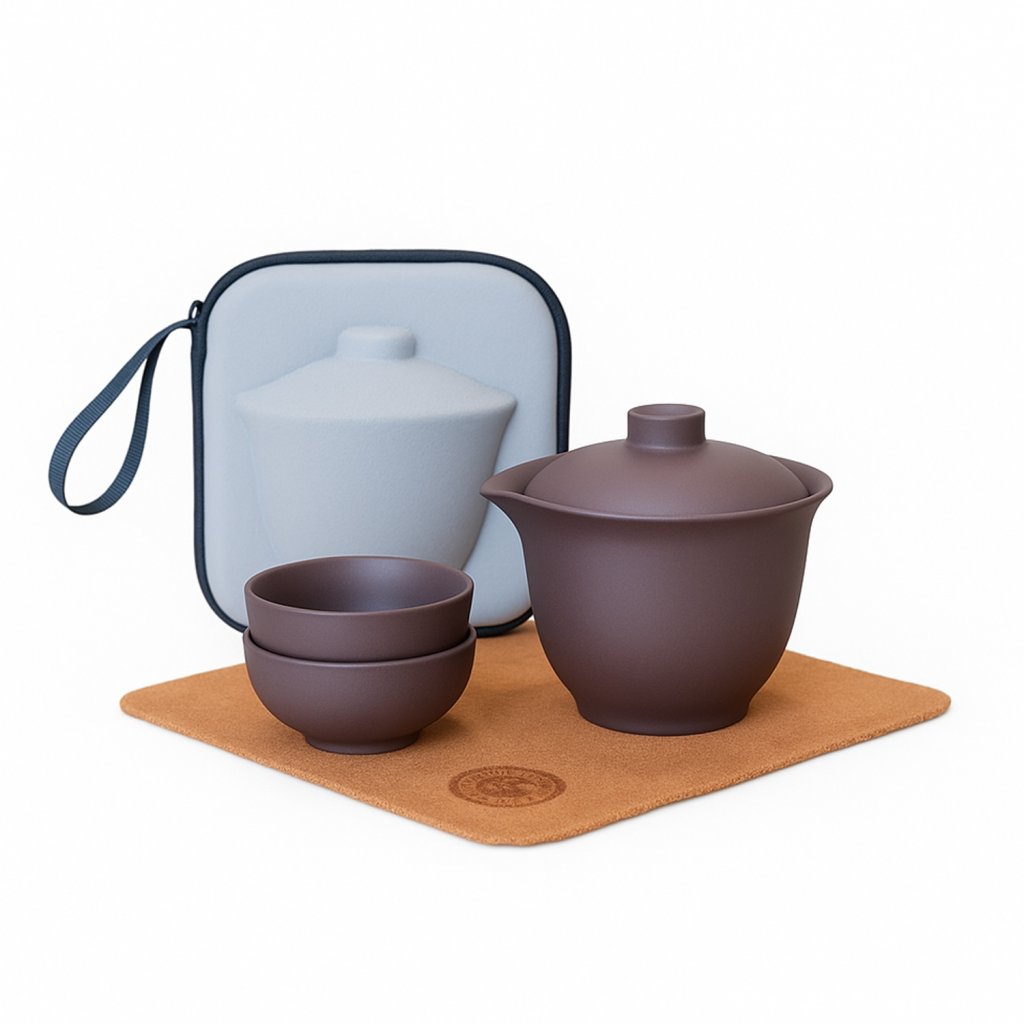 Elegantní Travel Tea Set TIAN s gaiwanem, dvěma šálky a cestovním pouzdrem. Ideální společník pro milovníky čaje, kteří si chtějí vychutnat svůj rituál kdekoliv na cestách.